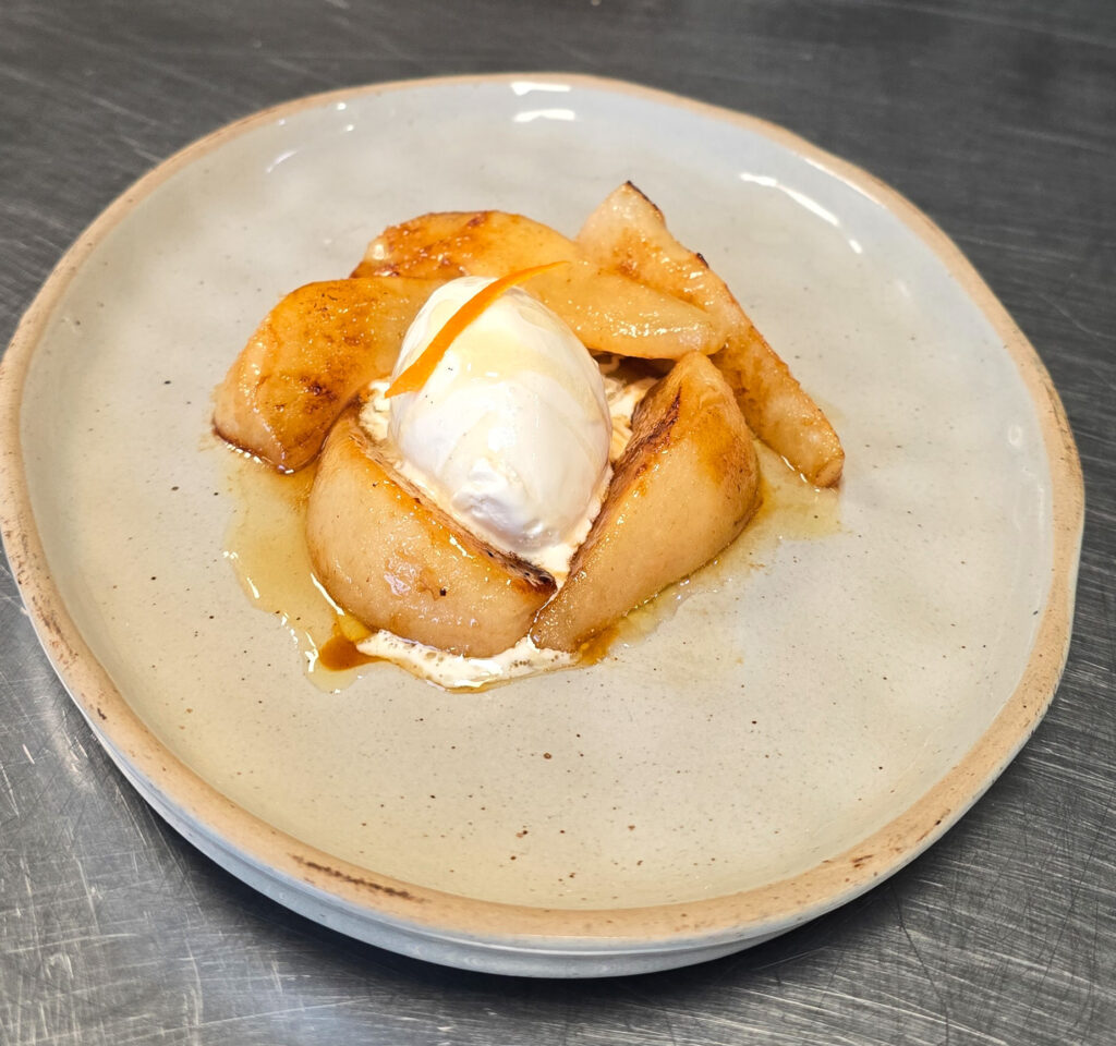Glace vanille crémeuse, poires rôties & réduction de balsamique à l’orange