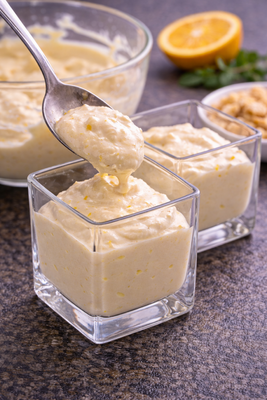 Mousse mascarpone & orange, coulis balsamique à l’orange