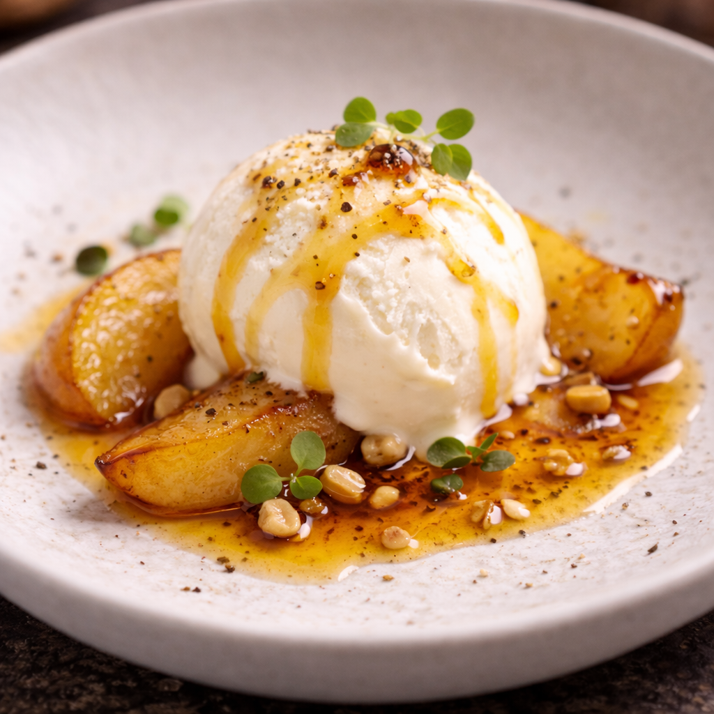 Glace vanille crémeuse, poires rôties & réduction de balsamique à l’orange