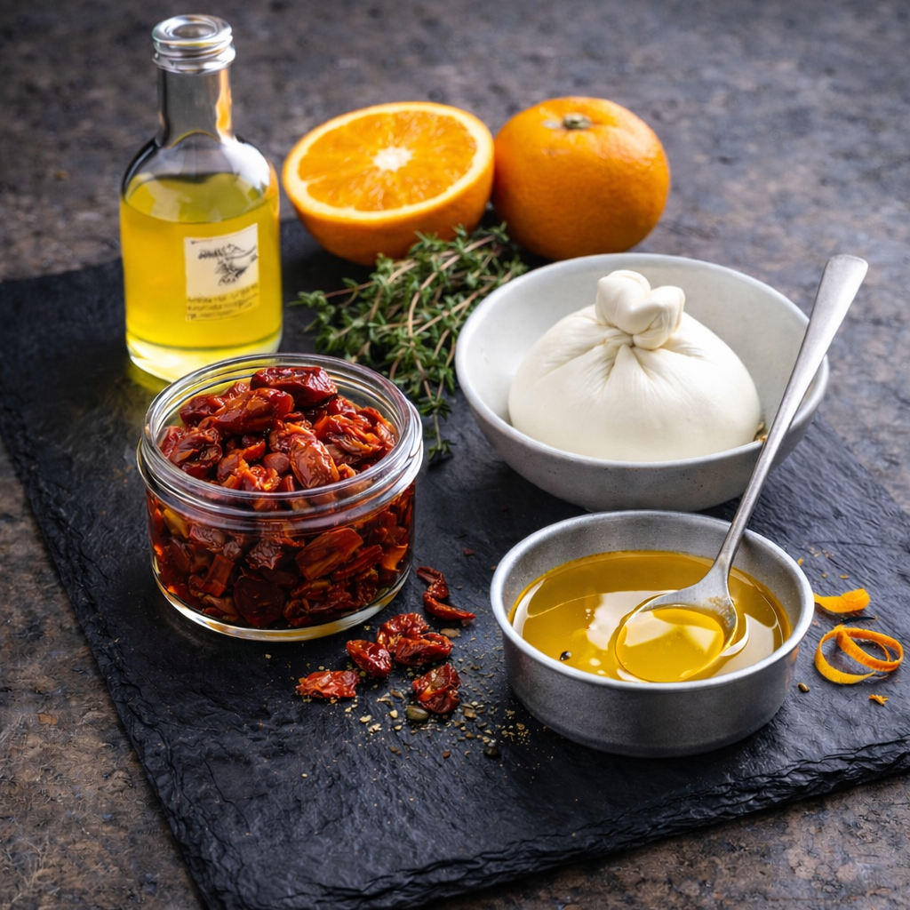 Burratina crémeuse, tomates semi-sèches & réduction de balsamique à l’orange