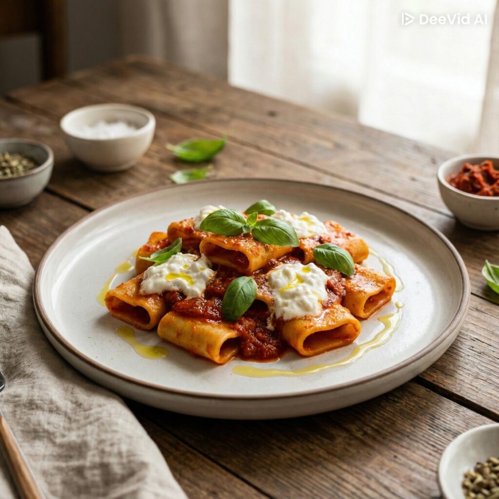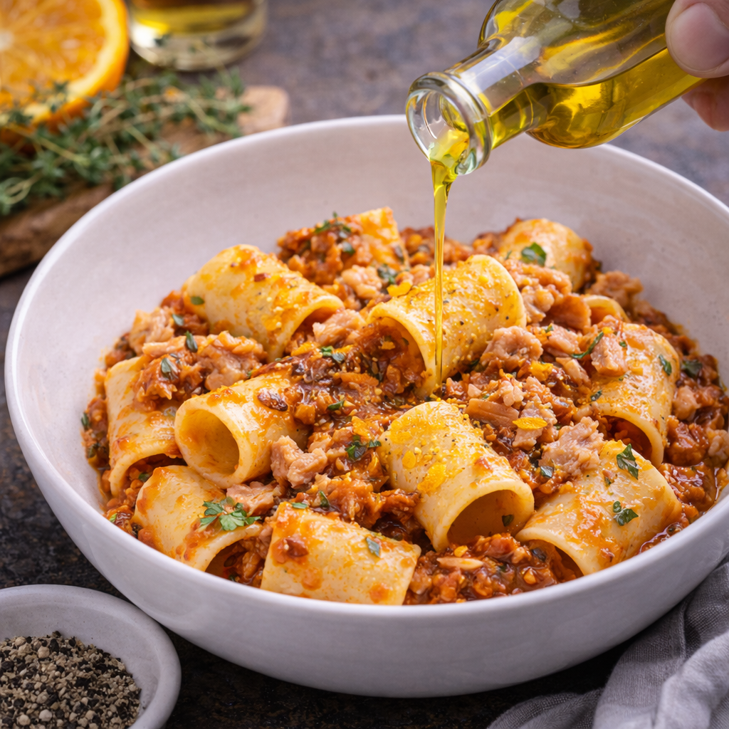 Paccheri frais au thon rouge, crème de tomates séchées & vinaigre balsamique à l’orange