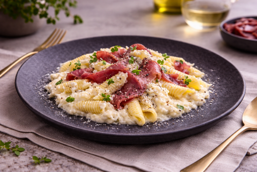 Garganelli à la Stracciatella fumée & Jambon de cerf