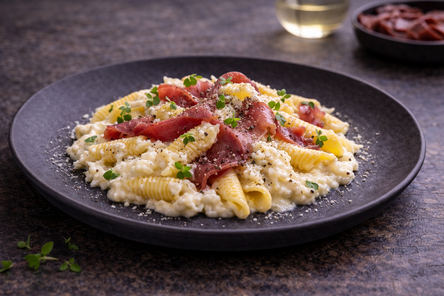 Garganelli à la Stracciatella fumée & Jambon de cerf