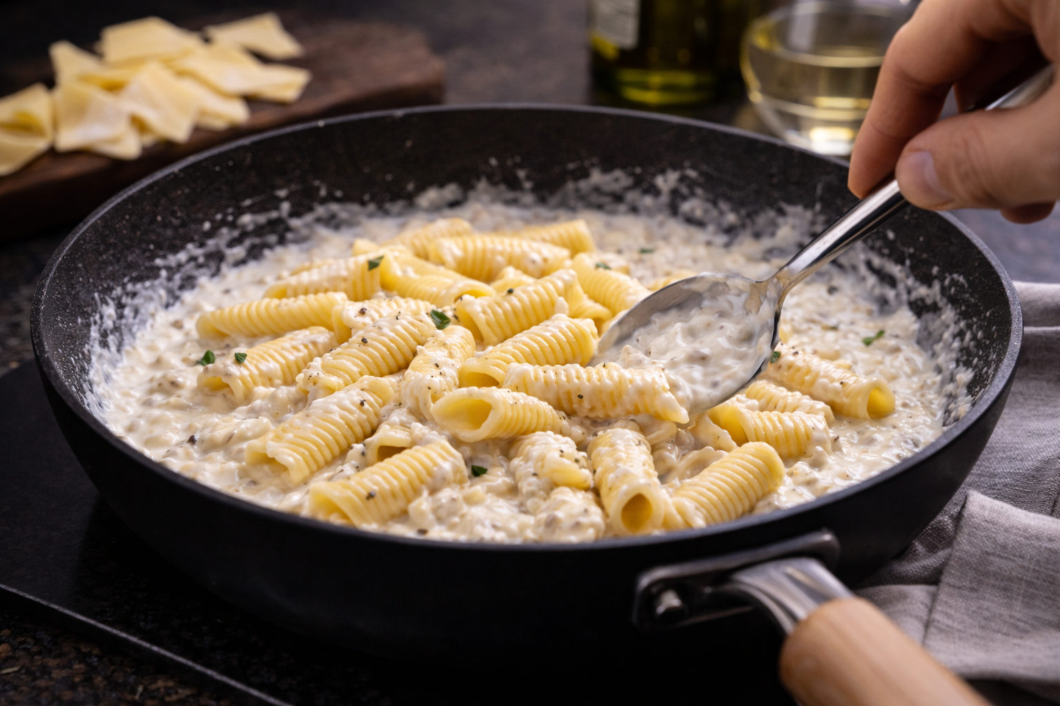 2.- Faites cuire les garganelli pendant 2 à 3 minutes. Égouttez-les en conservant un peu d’eau de cuisson, puis remettez-les dans la casserole. Versez la crème de stracciatella et mélangez délicatement jusqu’à obtenir un enrobage soyeux.