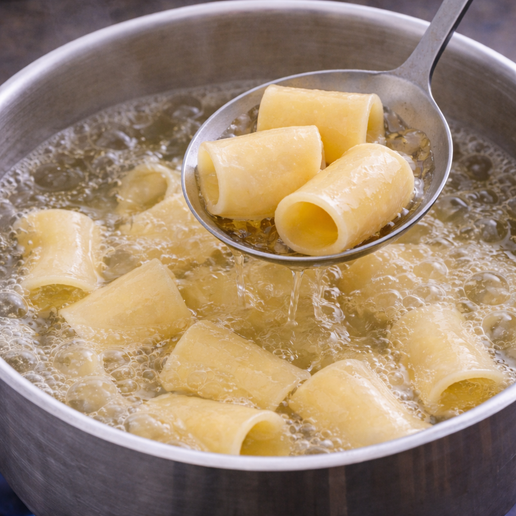 2- Plongez-y les paccheri et faites-les cuire selon le temps indiqué, jusqu’à ce qu’ils soient al dente. Conservez une louche d’eau de cuisson avant d’égoutter.