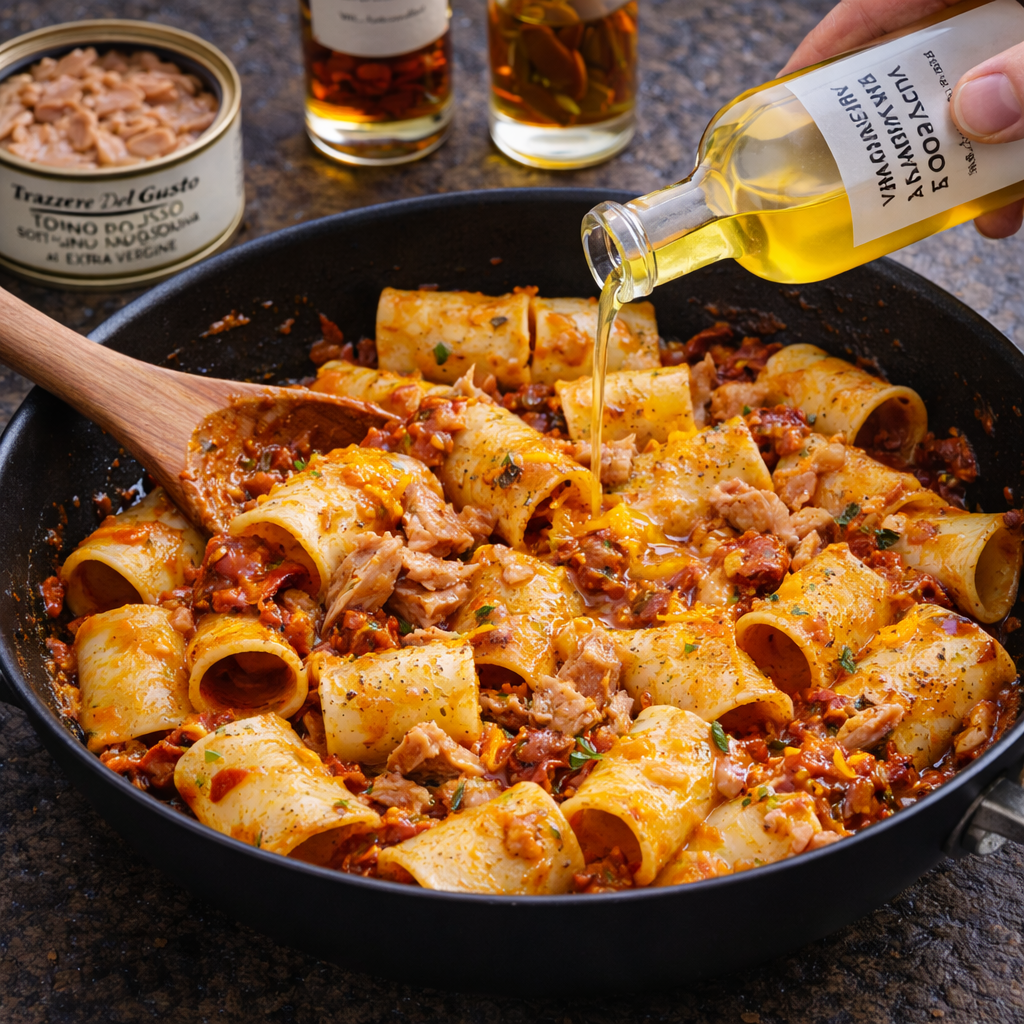 Des paccheri larges et fondants, enrobés d’une crème de tomates séchées intense et veloutée, sublimés par la finesse du thon rouge. Le vinaigre balsamique à l’orange vient apporter une touche finale subtilement acidulée, qui équilibre parfaitement la richesse du plat. Une recette facile à préparer, mais pleine de caractère, idéale pour transformer un repas du quotidien en moment de cuisine italienne raffinée.