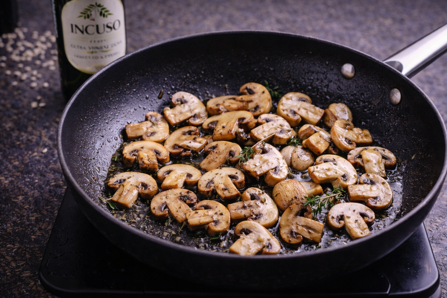 1.- Nettoyez les champignons et faites-les revenir dans une poêle avec un filet d’huile d’olive jusqu’à légère coloration. Réservez.