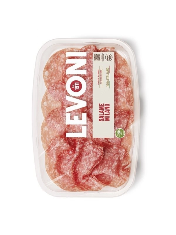 Découvrez l’authenticité du Salami Milano Levoni, célèbre pour sa mouture fine en “grain de riz” qui lui confère une texture unique et raffinée. Son parfum délicat enveloppe les sens, tandis que sa saveur douce, subtilement épicée, révèle de légères notes de poivre blanc et de noix.
