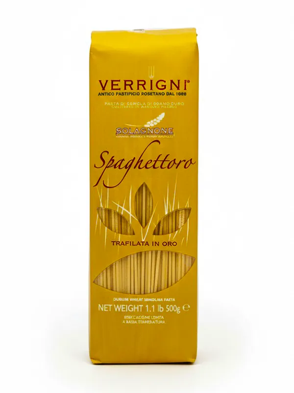 Symbole du savoir-faire artisanal italien, les Spaghettoro Verrigni sont élaborés avec du blé dur de haute qualité, cultivé avec soin dans les Abruzzes.grâce à un procédé de tréfilage à l’or, ces pâtes bénéficient d’une texture incomparable qui leur permet de capturer et sublimer chaque sauce avec élégance.
