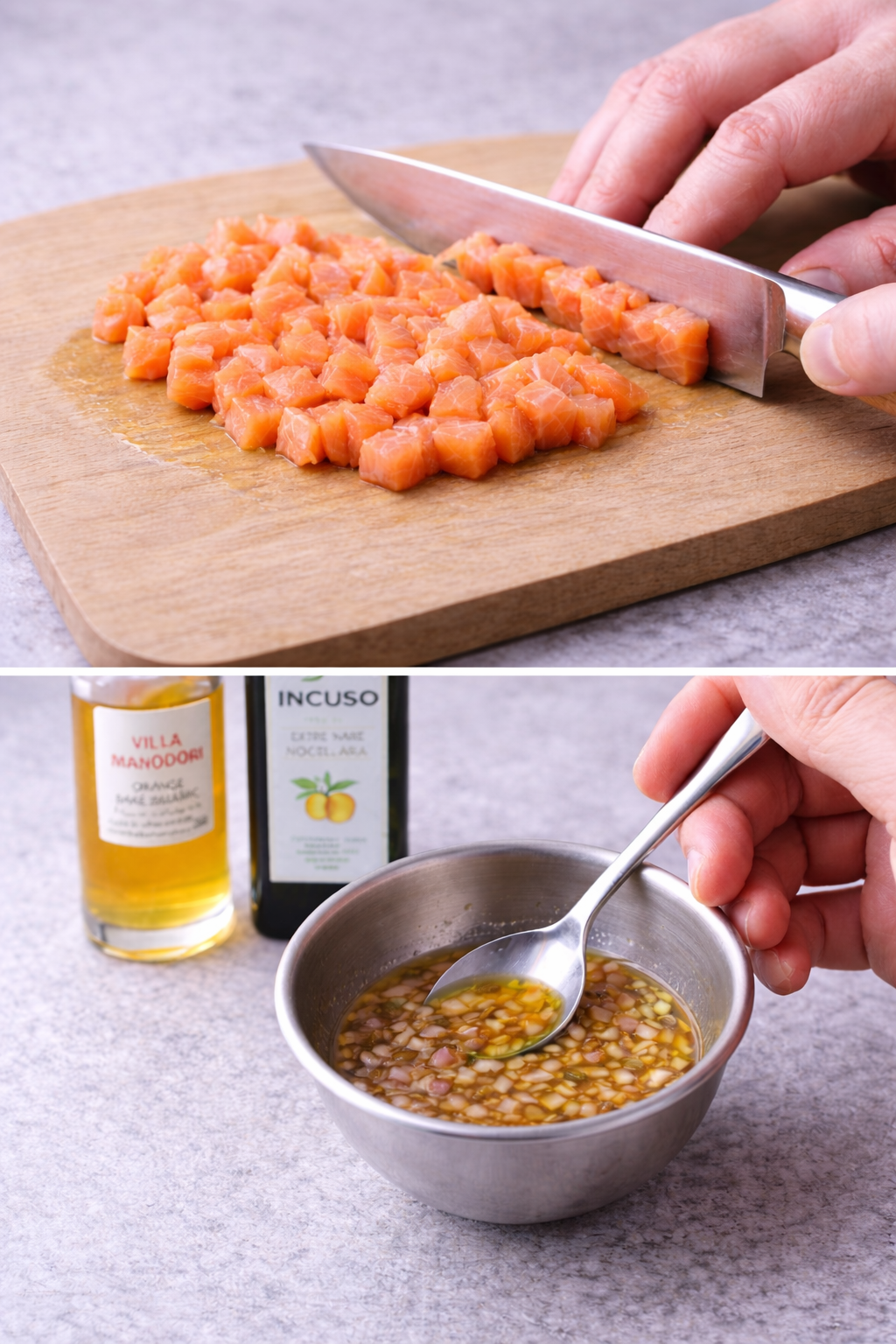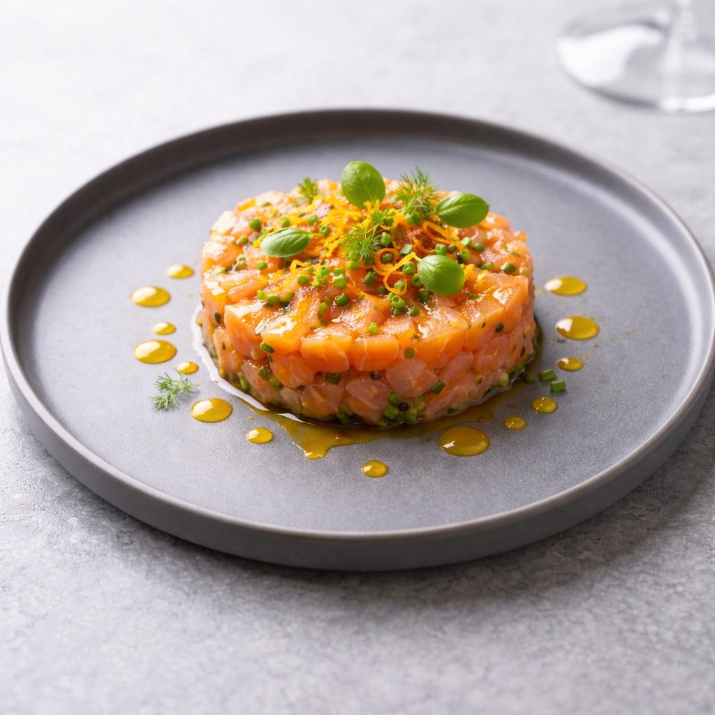 Un tartare frais, vif et délicat, où la douceur beurrée du saumon se marie à la rondeur acidulée d’un balsamique à l’orange subtil et aromatique.